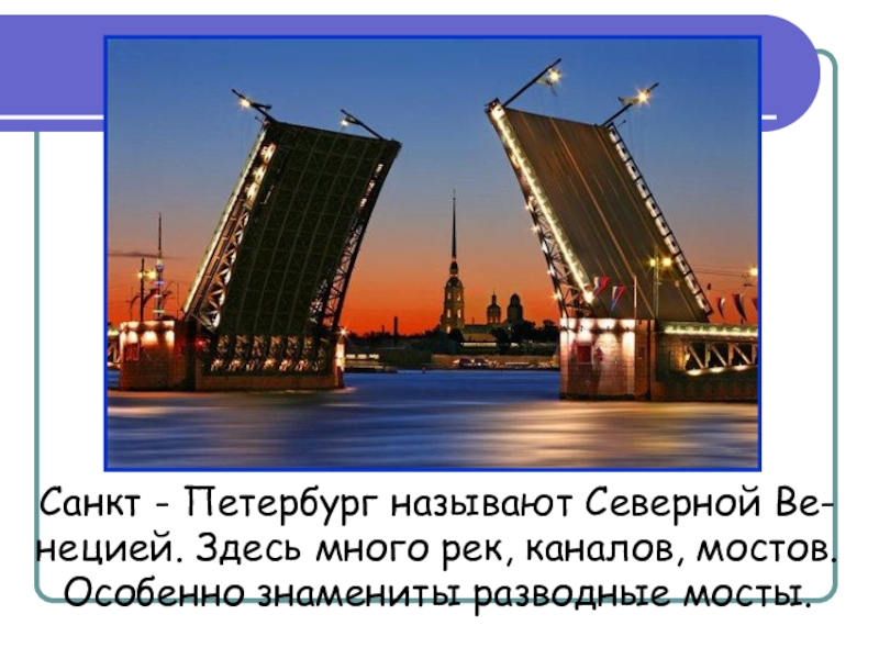 Санкт - Петербург называют Северной Ве-нецией. Здесь много рек, каналов, мостов.Особенно знамениты разводные мосты.