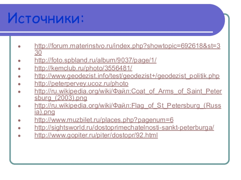 Источники:http://forum.materinstvo.ru/index.php?showtopic=692618&st=330http://foto.spbland.ru/album/9037/page/1/http://kemclub.ru/photo/3556481/http://www.geodezist.info/test/geodezist+/geodezist_politik.phphttp://peterpervey.ucoz.ru/photohttp://ru.wikipedia.org/wiki/Файл:Coat_of_Arms_of_Saint_Petersburg_(2003).pnghttp://ru.wikipedia.org/wiki/Файл:Flag_of_St_Petersburg_(Russia).pnghttp://www.muzbilet.ru/places.php?pagenum=6http://sightsworld.ru/dostoprimechatelnosti-sankt-peterburga/http://www.gopiter.ru/piter/dostopr/92.html