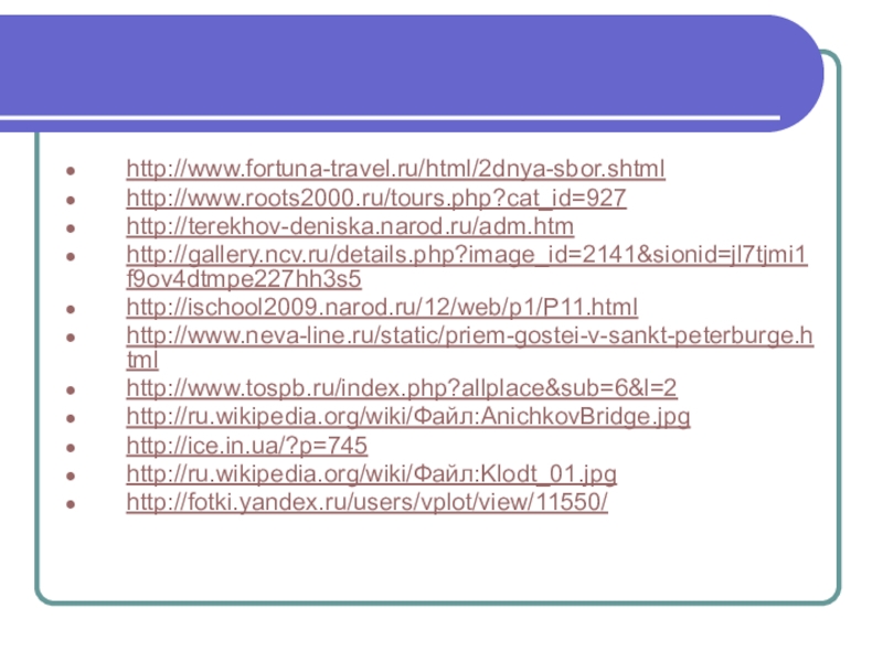 http://www.fortuna-travel.ru/html/2dnya-sbor.shtmlhttp://www.roots2000.ru/tours.php?cat_id=927http://terekhov-deniska.narod.ru/adm.htmhttp://gallery.ncv.ru/details.php?image_id=2141&sionid=jl7tjmi1f9ov4dtmpe227hh3s5http://ischool2009.narod.ru/12/web/p1/P11.htmlhttp://www.neva-line.ru/static/priem-gostei-v-sankt-peterburge.htmlhttp://www.tospb.ru/index.php?allplace&sub=6&l=2http://ru.wikipedia.org/wiki/Файл:AnichkovBridge.jpghttp://ice.in.ua/?p=745http://ru.wikipedia.org/wiki/Файл:Klodt_01.jpghttp://fotki.yandex.ru/users/vplot/view/11550/