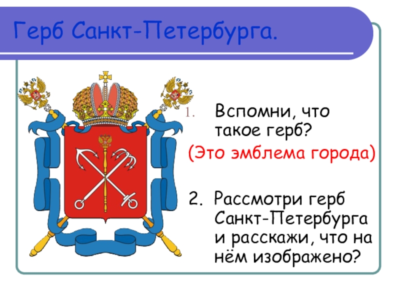 Герб Санкт-Петербурга.Вспомни, что такое герб?(Это эмблема города)2. Рассмотри герб Санкт-Петербурга и расскажи, что на нём изображено?
