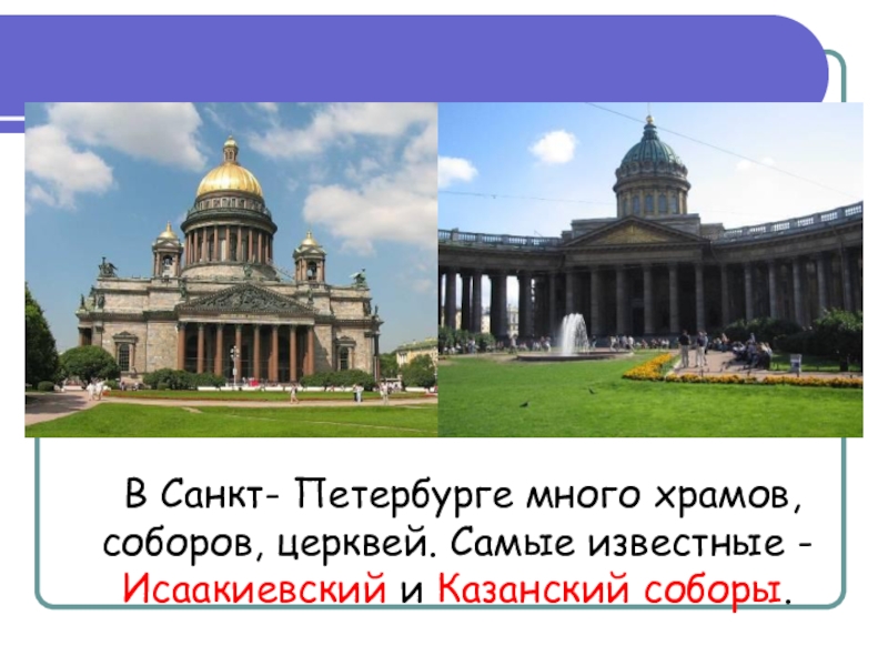 В Санкт- Петербурге много храмов, соборов, церквей. Самые известные - Исаакиевский и Казанский соборы.