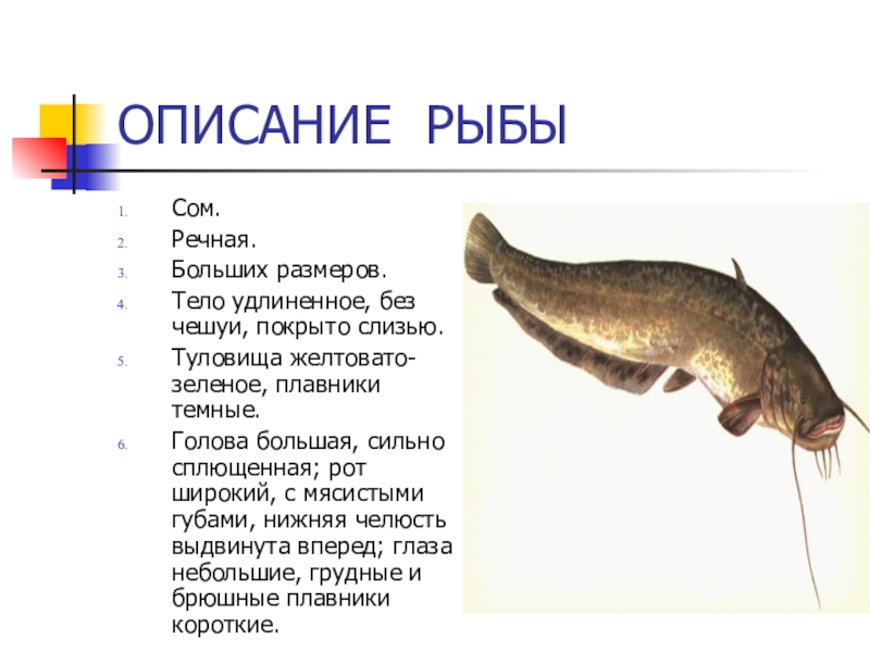 ОПИСАНИЕ РЫБЫСом.Речная.Больших размеров.Тело удлиненное, без чешуи, покрыто слизью.Туловища желтовато-зеленое, плавники темные.Голова большая, сильно сплющенная; рот широкий, с