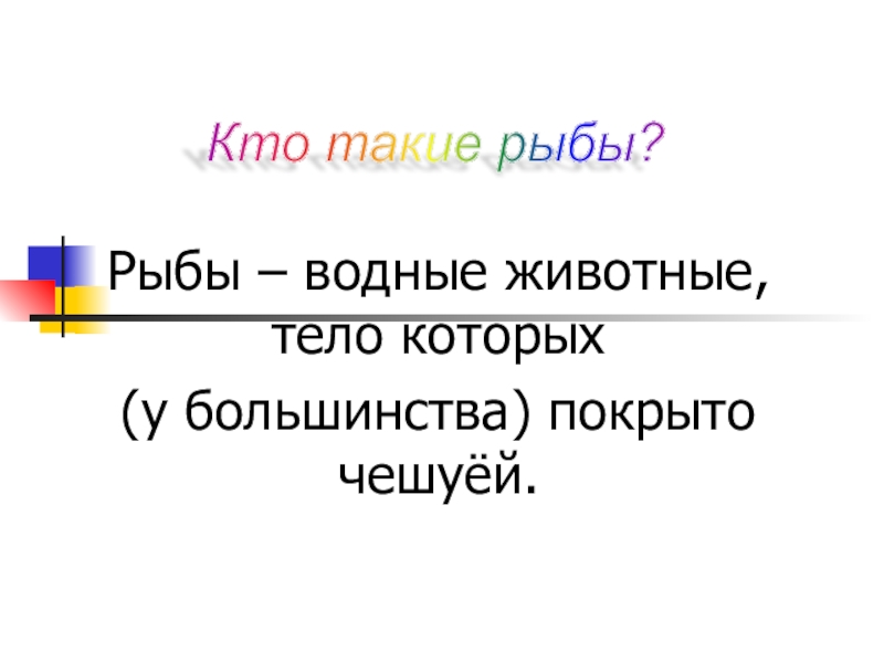 Рыбы – водные животные, тело которых (у большинства) покрыто чешуёй.Кто такие рыбы?