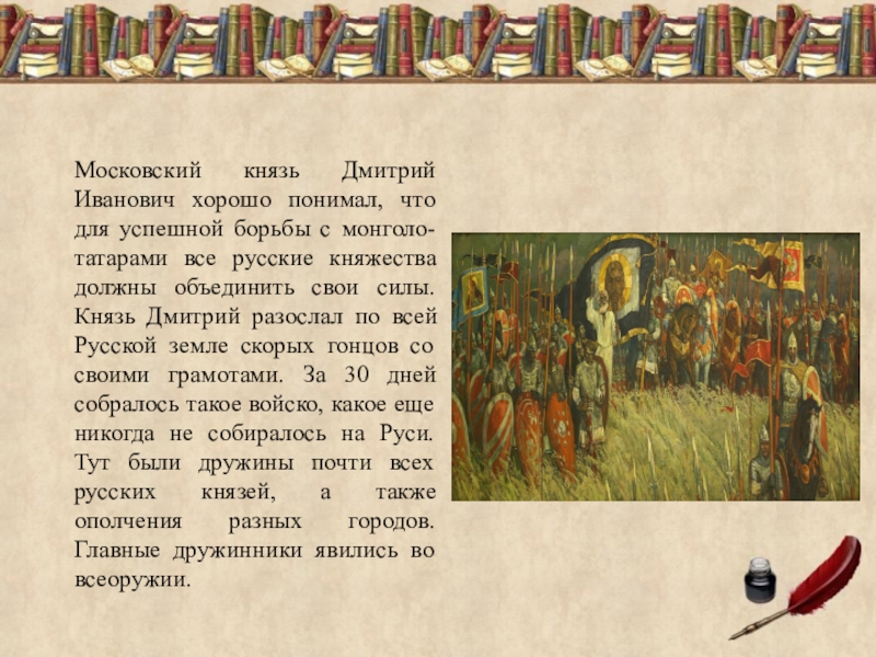 монголо-татарами все русские княжества должны объединить свои силы. Князь Дмитрий разослал по всей Русской земле скорых гонцов со своими грамотами. За 30 дней собралось такое войско, какое еще никогда не собиралось на Руси. Тут были дружины почти всех русских князей, а также ополчения разных городов. Главные дружинники явились во всеоружии.