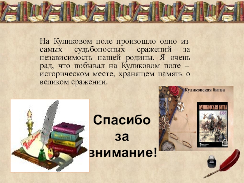 независимость нашей родины. Я очень рад, что побывал на Куликовом поле – историческом месте, хранящем память о великом сражении.