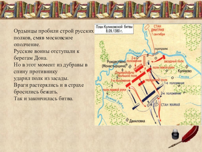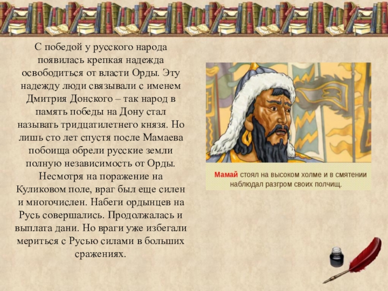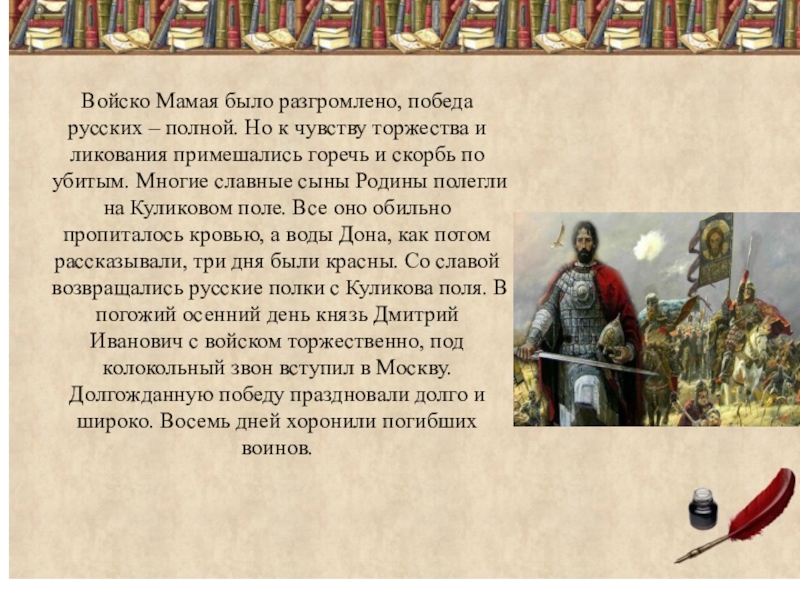 Слайд 10Войско Мамая было разгромлено, победа русских – полной. Но к чувству