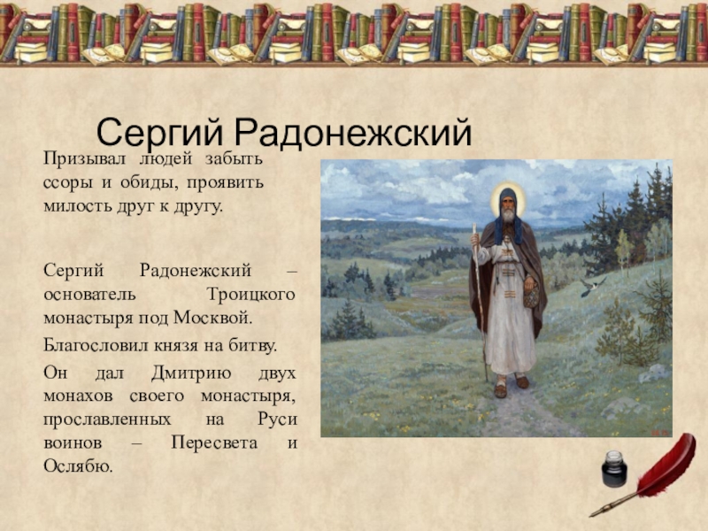 Он дал Дмитрию двух монахов своего монастыря, прославленных на Руси воинов – Пересвета и Ослябю.