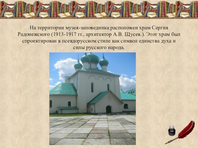 Слайд 13На территории музея-заповедника расположен храм Сергия Радонежского (1913-1917 гг., архитектор А.В.