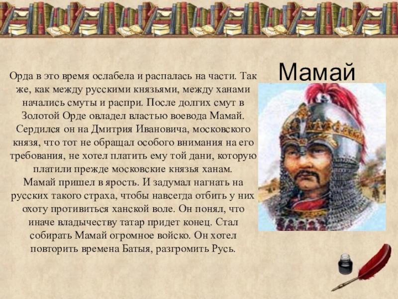 как между русскими князьями, между ханами начались смуты и распри. После долгих смут в Золотой Орде овладел властью воевода Мамай. Сердился он на Дмитрия Ивановича, московского князя, что тот не обращал особого внимания на его требования, не хотел платить ему той дани, которую платили прежде московские князья ханам.
