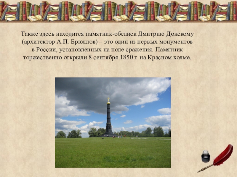 Слайд 16Также здесь находится памятник-обелиск Дмитрию Донскому (архитектор А.П. Брюллов) – это