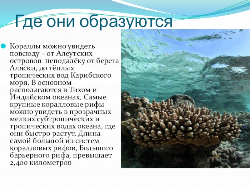 от берега Аляски, до тёплых тропических вод Карибского моря. В основном располагаются в Тихом и Индийском океанах. Самые крупные коралловые рифы можно увидеть в прозрачных мелких субтропических и тропических водах океана, где они быстро растут. Длина самой большой из систем коралловых рифов, Большого барьерного рифа, превышает 2,400 километров