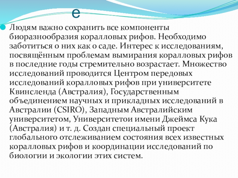 них как о саде. Интерес к исследованиям, посвящённым проблемам вымирания коралловых рифов в последние годы стремительно возрастает. Множество исследований проводится Центром передовых исследований коралловых рифов при университете Квинсленда (Австралия), Государственным объединением научных и прикладных исследований в Австралии (CSIRO), Западным Австралийским университетом, Университетои имени Джеймса Кука (Австралия) и т. д. Создан специальный проект глобального отслеживанием состояния всех известных коралловых рифов и координации исследований по биологии и экологии этих систем.