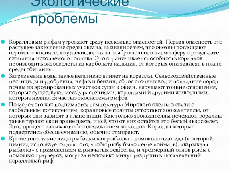 Коралловым рифам угрожают сразу несколько опасностей. Первая опасность это растущее