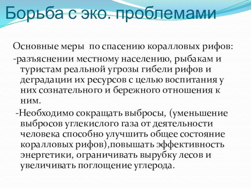 -Необходимо сокращать выбросы, (уменьшение выбросов углекислого газа от деятельности человека способно улучшить общее состояние коралловых рифов),повышать эффективность энергетики, ограничивать вырубку лесов и увеличивать поглощение углерода.