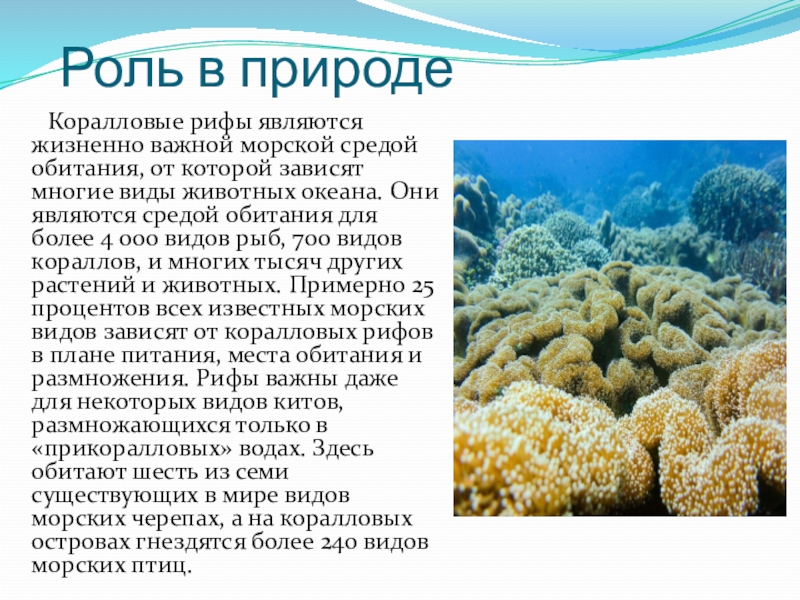 которой зависят многие виды животных океана. Они являются средой обитания для более 4 000 видов рыб, 700 видов кораллов, и многих тысяч других растений и животных. Примерно 25 процентов всех известных морских видов зависят от коралловых рифов в плане питания, места обитания и размножения. Рифы важны даже для некоторых видов китов, размножающихся только в «прикоралловых» водах. Здесь обитают шесть из семи существующих в мире видов морских черепах, а на коралловых островах гнездятся более 240 видов морских птиц.