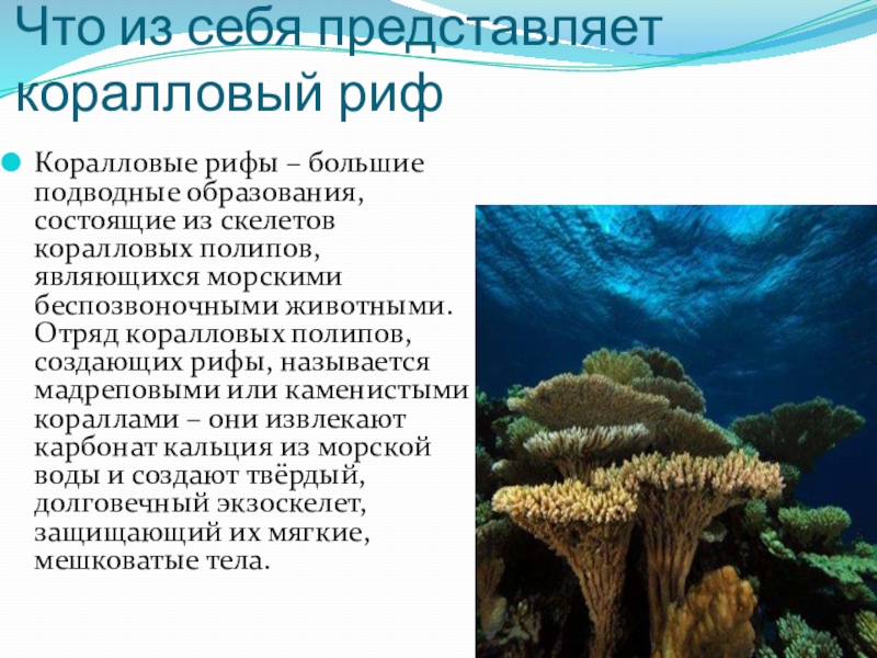 состоящие из скелетов коралловых полипов, являющихся морскими беспозвоночными животными. Отряд коралловых полипов, создающих рифы, называется мадреповыми или каменистыми кораллами – они извлекают карбонат кальция из морской воды и создают твёрдый, долговечный экзоскелет, защищающий их мягкие, мешковатые тела.