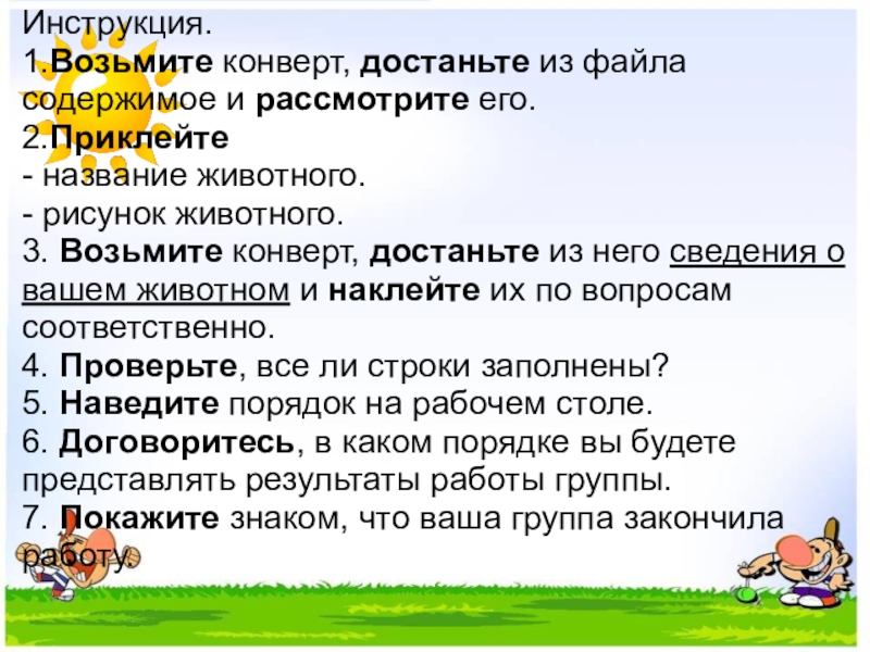 Инструкция.1.Возьмите конверт, достаньте из файла содержимое и рассмотрите его.2.Приклейте - название животного.- рисунок животного.3. Возьмите конверт, достаньте