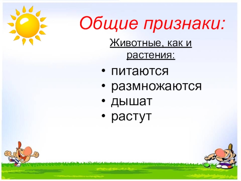 Общие признаки:питаютсяразмножаются дышат растутЖивотные, как и растения: