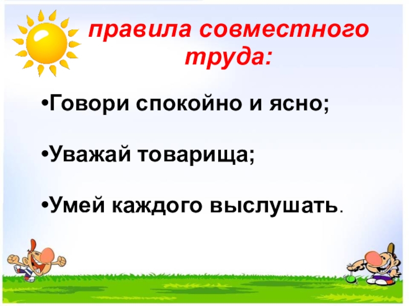 •Говори спокойно и ясно;•Уважай товарища;•Умей каждого выслушать.правила совместного труда: