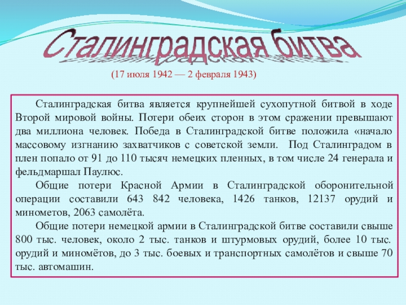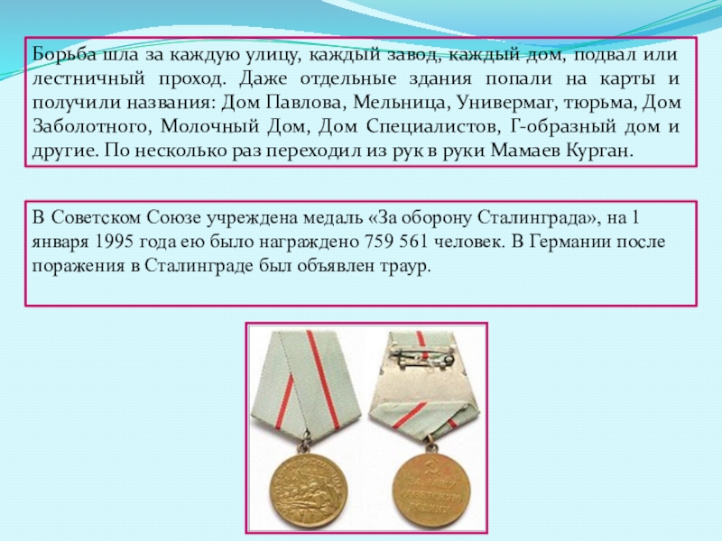 В Советском Союзе учреждена медаль «За оборону Сталинграда», на 1 января 1995 года ею было награждено 759 561 человек. В Германии после поражения в Сталинграде был объявлен траур.
