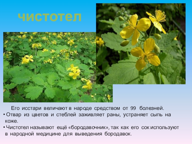 чистотел   Его исстари величают в народе средством от 99  болезней. Отвар из цветов и