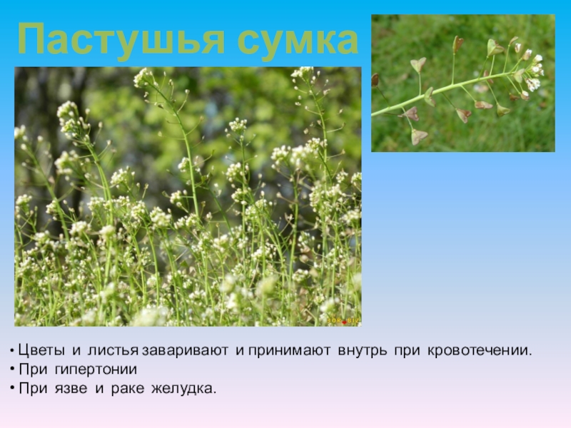 Пастушья сумка Цветы и листья заваривают и принимают внутрь при кровотечении. При гипертонии При язве и раке