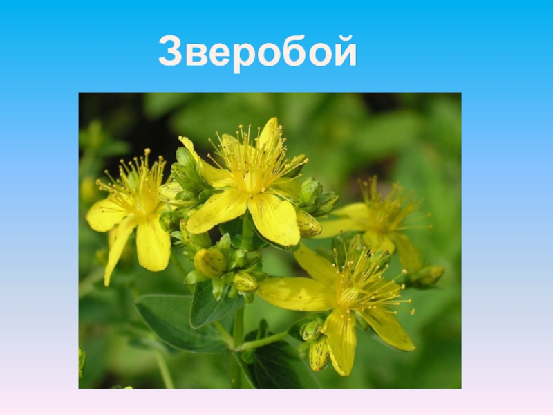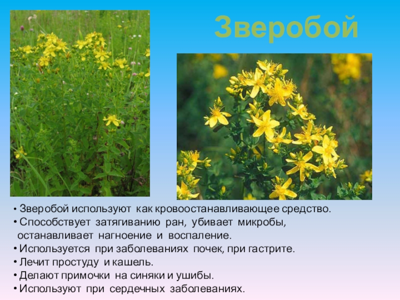 Зверобой Зверобой используют как кровоостанавливающее средство. Способствует затягиванию ран, убивает микробы, останавливает нагноение и воспаление. Используется при