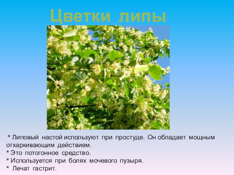 Цветки липы * Липовый настой используют при простуде. Он обладает мощным отхаркивающим действием.* Это потогонное средство.* Используется