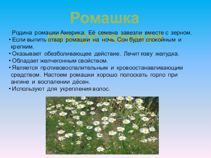 Ромашка  лекарственная Родина ромашки Америка. Её семена завезли вместе с зерном. Если выпить отвар ромашки на