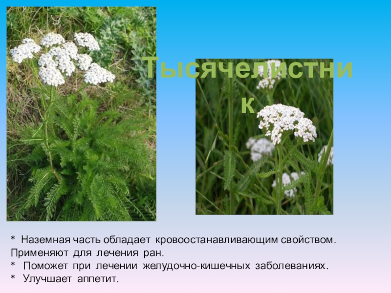 Тысячелистник* Наземная часть обладает кровоостанавливающим свойством. Применяют для лечения ран.*  Поможет при лечении желудочно-кишечных