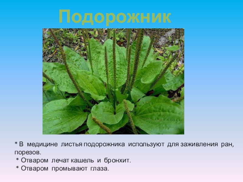 Подорожник * В медицине листья подорожника используют для заживления ран, порезов. * Отваром