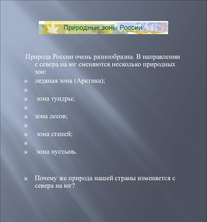Слайд 3Природа России очень разнообразна. В направлении с севера на юг сменяются