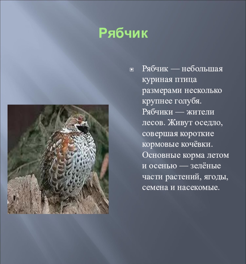Рябчик — небольшая куриная птица размерами несколько крупнее голубя. Рябчики