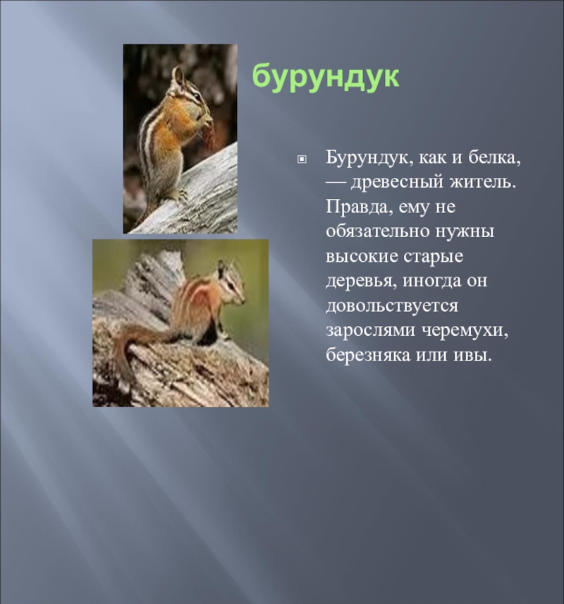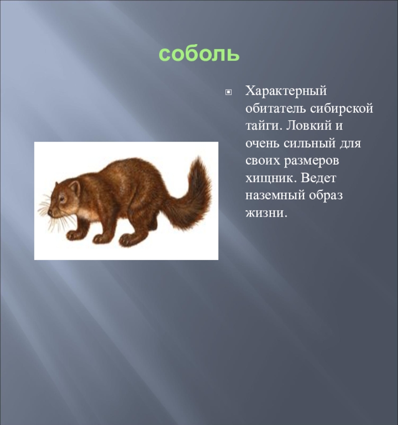 Слайд 22 Многочисленны и широко распространены: рысь, росомаха, бурундук, соболь, белка и др. Из копытных