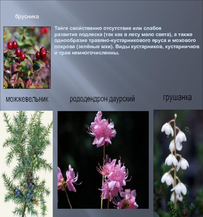 мало света), а также однообразие травяно-кустарникового яруса и мохового покрова (зелёные мхи). Виды кустарников, кустарничков и трав немногочисленны.