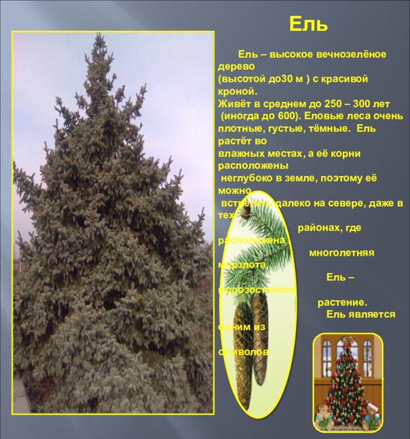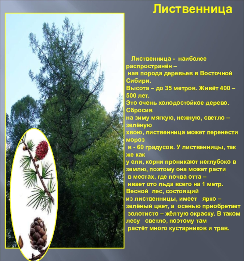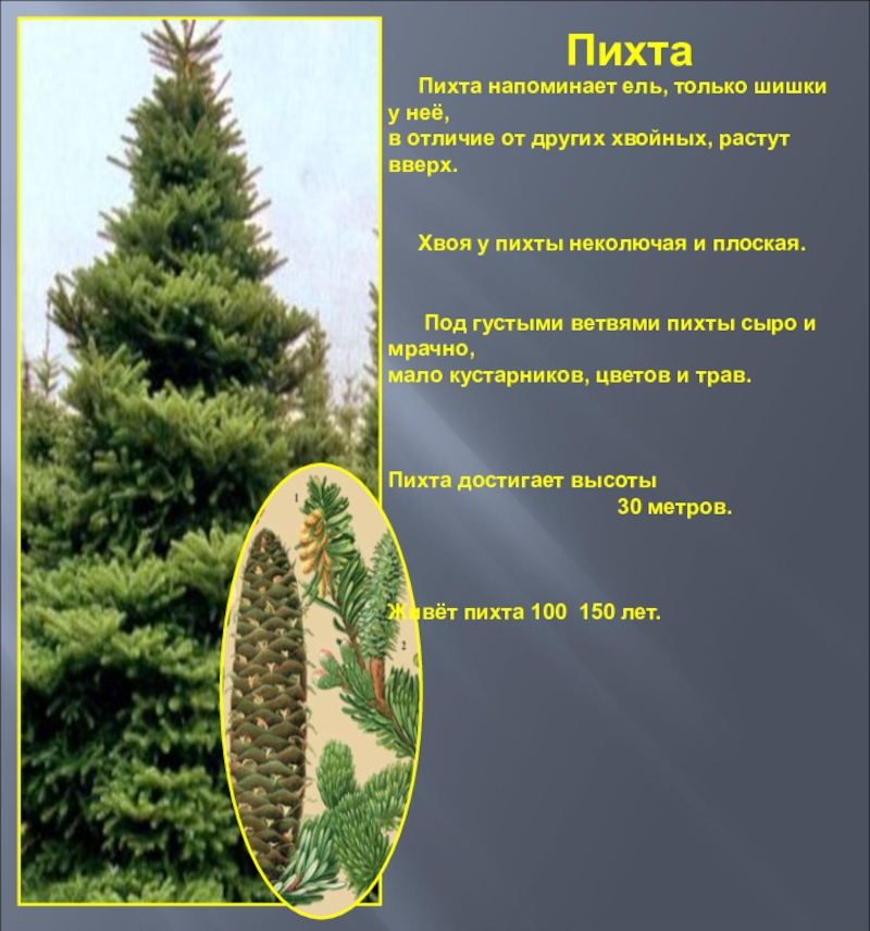 Высота – до 35 метров. Живёт 400 – 500 лет.