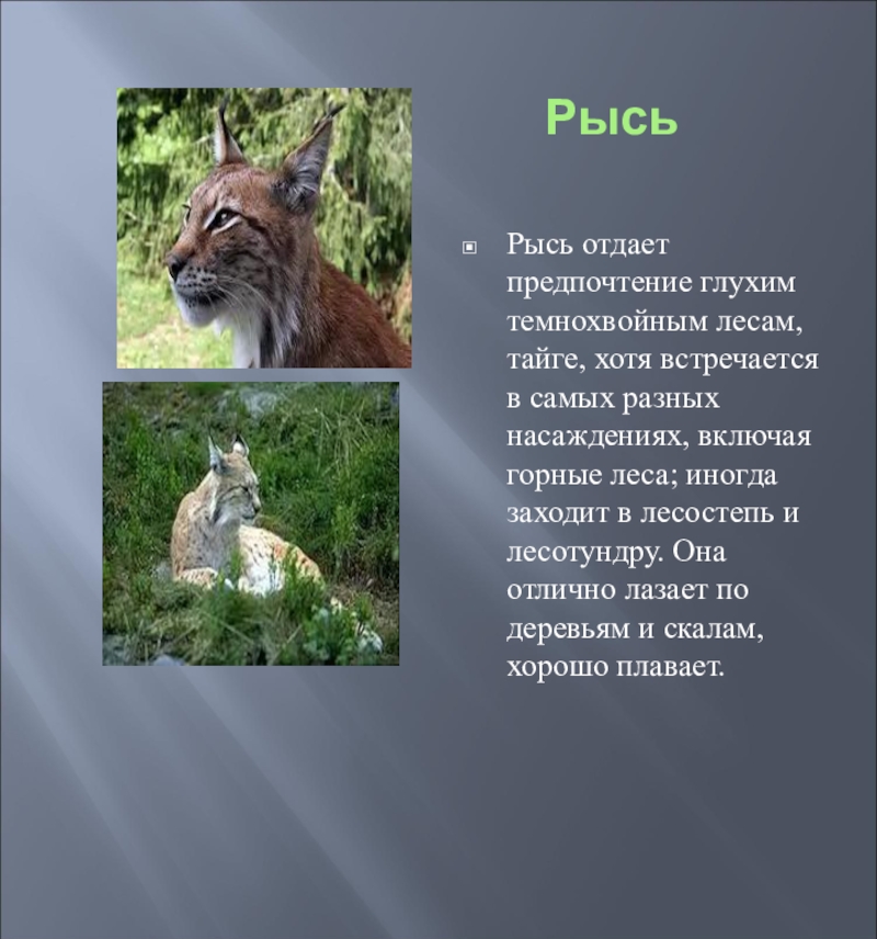 Рысь отдает предпочтение глухим темнохвойным лесам, тайге, хотя встречается в самых разных насаждениях, включая горные леса; иногда заходит в лесостепь и лесотундру. Она отлично лазает по деревьям и скалам, хорошо плавает.