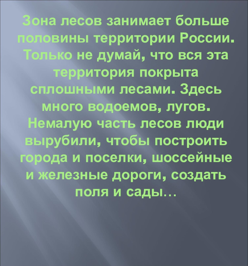 Слайд 7Зона лесов занимает больше половины территории России. Только не думай, что