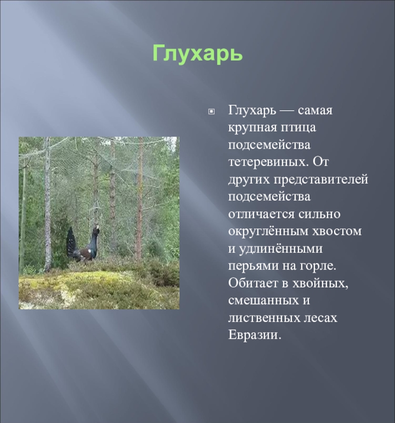 Глухарь — самая крупная птица подсемейства тетеревиных. От других представителей