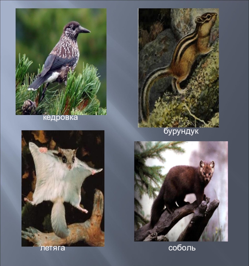встречаются северный и Благородный олень, лось, косуля; многочисленны зайцы, бурозубки, грызуны: мыши, полёвки, белки обыкновенная и летяга, бурундуки. Из птиц обычны: глухарь, обыкновенный рябчик, кедровка, клесты и др. В таёжном лесу по сравнению с лесотундрой благоприятнее условия для жизни животных. Здесь больше оседлых животных. Нигде в мире, кроме тайги, не водится столько пушных зверей.