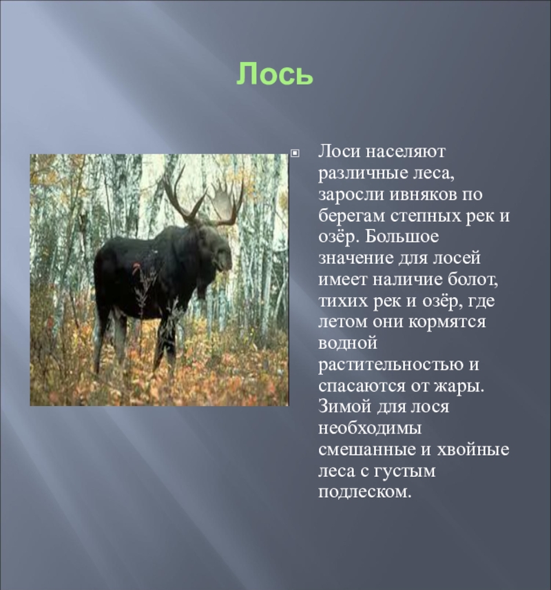 и озёр. Большое значение для лосей имеет наличие болот, тихих рек и озёр, где летом они кормятся водной растительностью и спасаются от жары. Зимой для лося необходимы смешанные и хвойные леса с густым подлеском.
