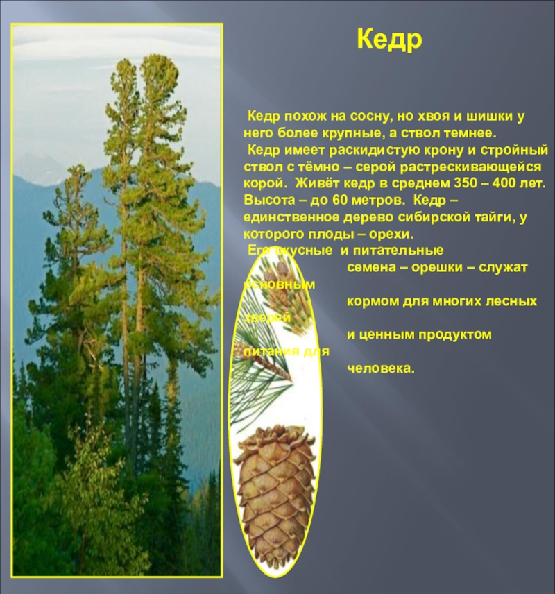 ствол с тёмно – серой растрескивающейся корой. Живёт кедр в среднем 350 – 400 лет. Высота – до 60 метров. Кедр – единственное дерево сибирской тайги, у которого плоды – орехи.