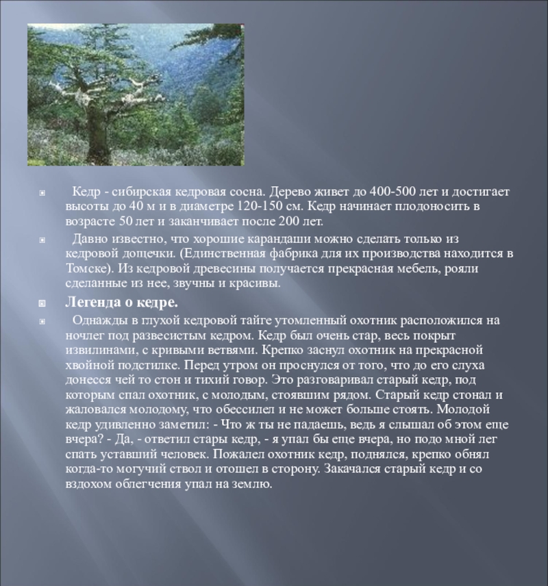 Слайд 19 Кедр - сибирская кедровая сосна. Дерево живет до 400-500 лет
