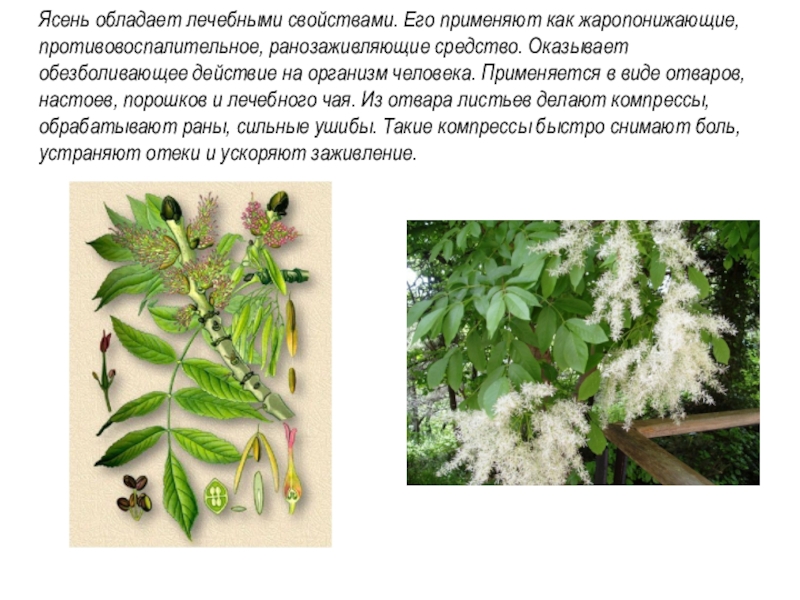 Слайд 8 Ясень обладает лечебными свойствами. Его применяют как жаропонижающие, противовоспалительное, ранозаживляющие средство.