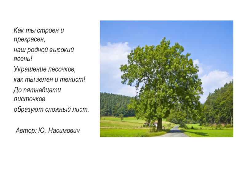 Как ты строен и прекрасен,наш родной высокий ясень!Украшение лесочков,как ты зелен и тенист!До пятнадцати листочковобразуют сложный лист. Автор: Ю. Насимович
