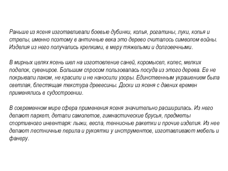 Слайд 7Раньше из ясеня изготавливали боевые дубинки, колья, рогатины, луки, копья и