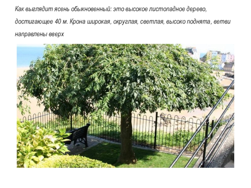 Слайд 4Как выглядит ясень обыкновенный: это высокое листопадное дерево, достигающее 40 м.