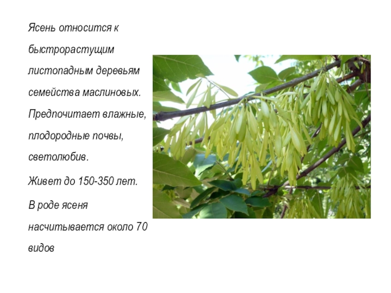 Слайд 3Ясень относится к быстрорастущим листопадным деревьям семейства маслиновых. Предпочитает влажные, плодородные