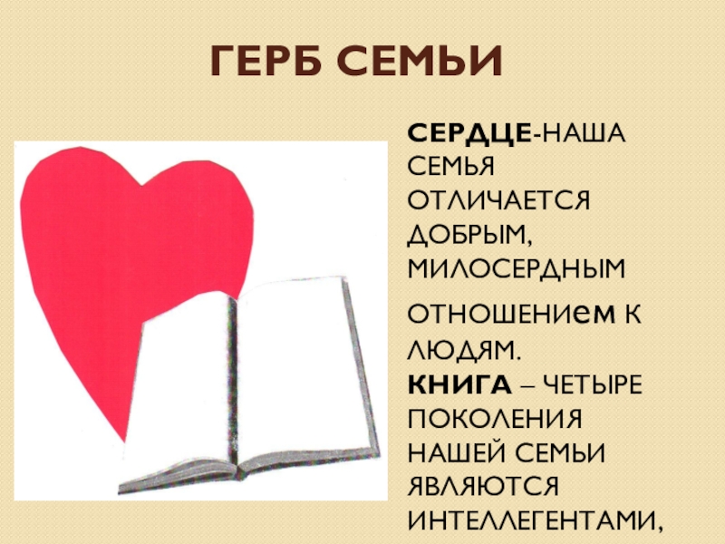 ГЕРБ СЕМЬИСЕРДЦЕ-НАША СЕМЬЯ ОТЛИЧАЕТСЯ ДОБРЫМ, МИЛОСЕРДНЫМ ОТНОШЕНИем К ЛЮДЯМ.КНИГА – ЧЕТЫРЕ ПОКОЛЕНИЯ НАШЕЙ СЕМЬИ ЯВЛЯЮТСЯ ИНТЕЛЛЕГЕНТАМИ, КОТОРЫЕ