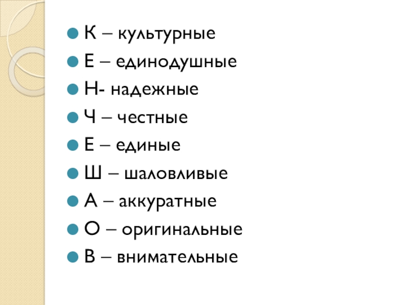 К – культурныеЕ – единодушныеН- надежныеЧ – честныеЕ – единыеШ – шаловливыеА – аккуратныеО – оригинальныеВ –